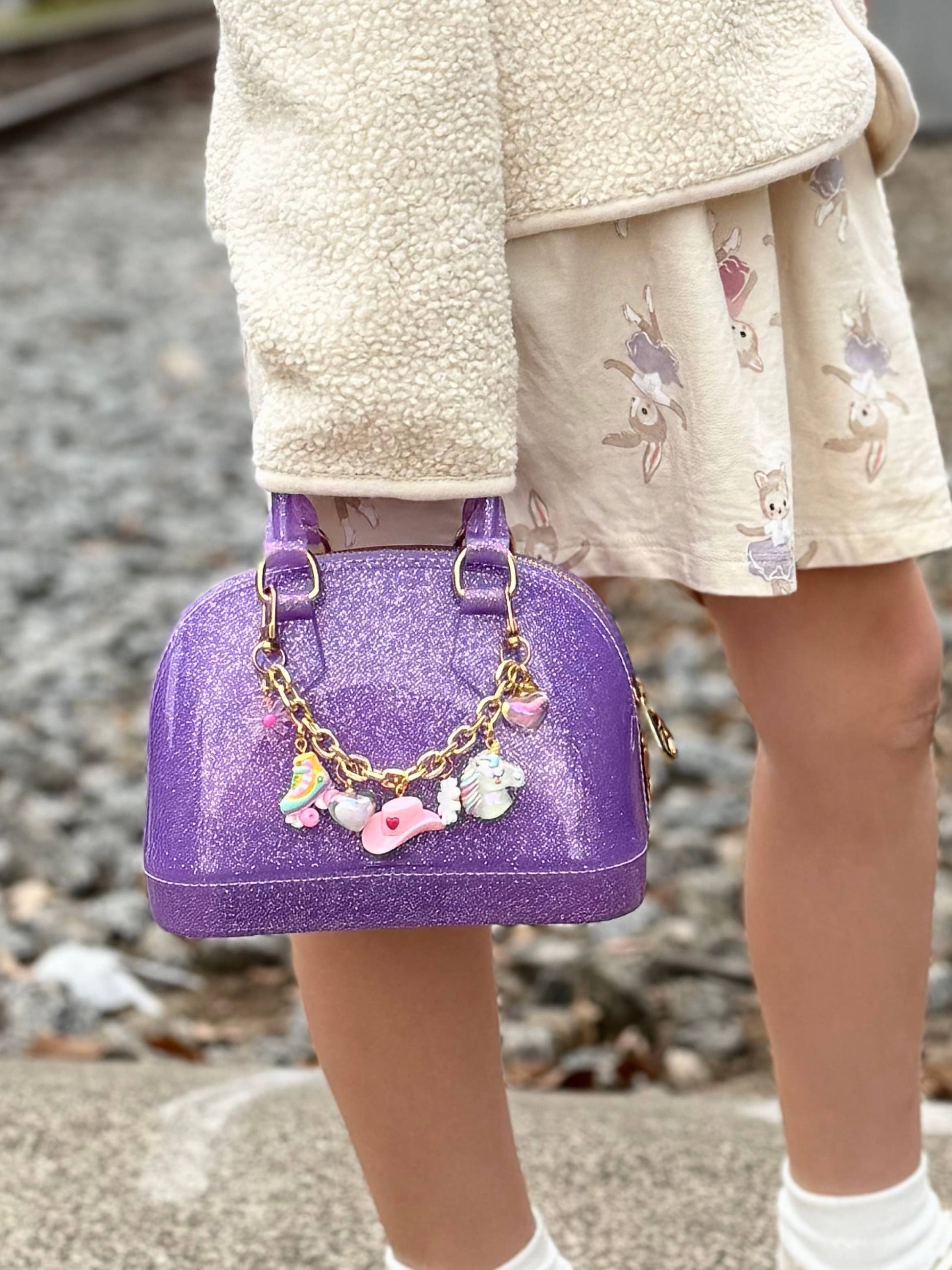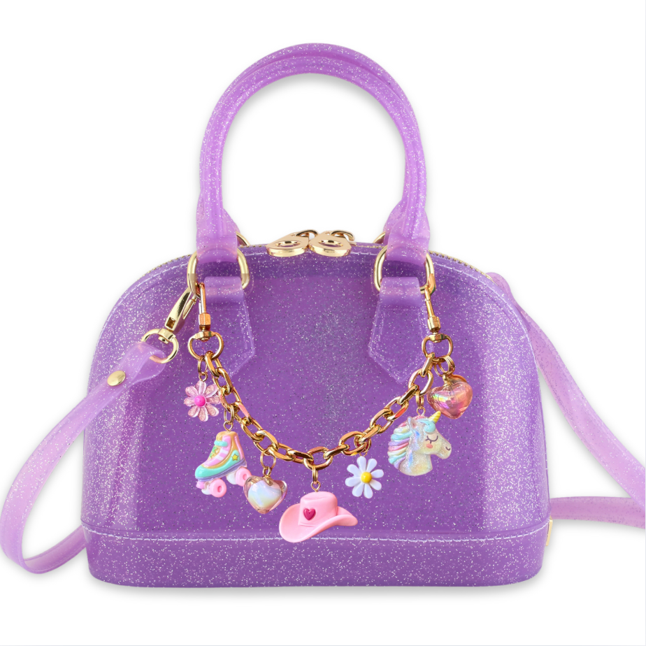 Meet Cate with our Let’s Go Girls Charming Chain, the ultimate sparkle jelly purse for every little girl. This playful bag comes decked out with all the charms guaranteed to make her smile: sweet hearts, pretty flowers, a magical unicorn, a pink cowboy hat, and even a roller skate to get her where she’s going. It’s whimsical, bright, and full of personality… just like her! 💖