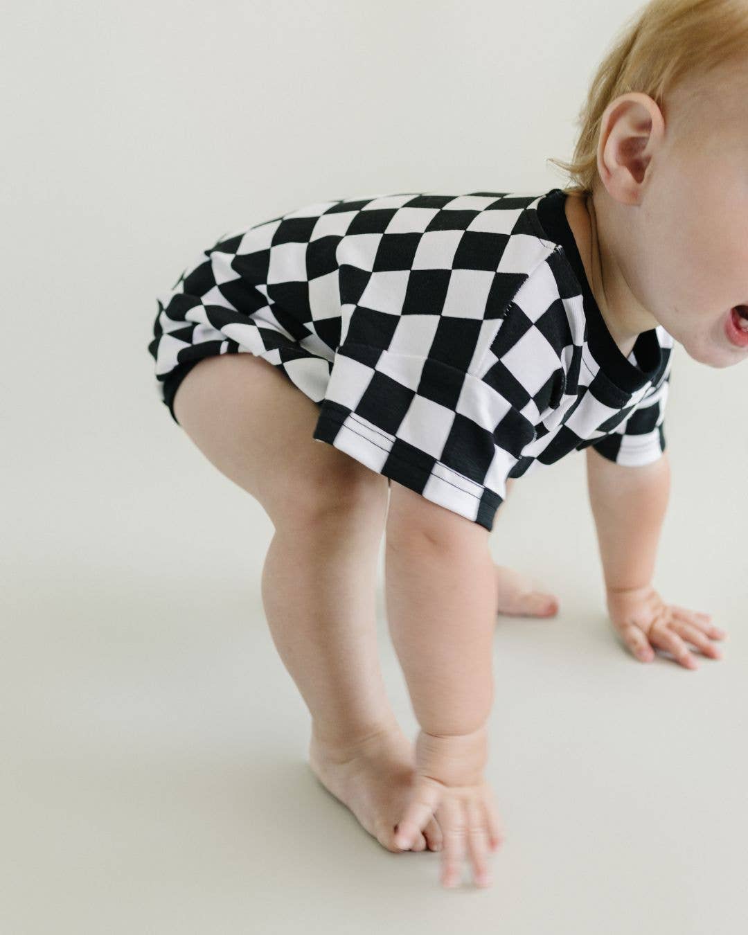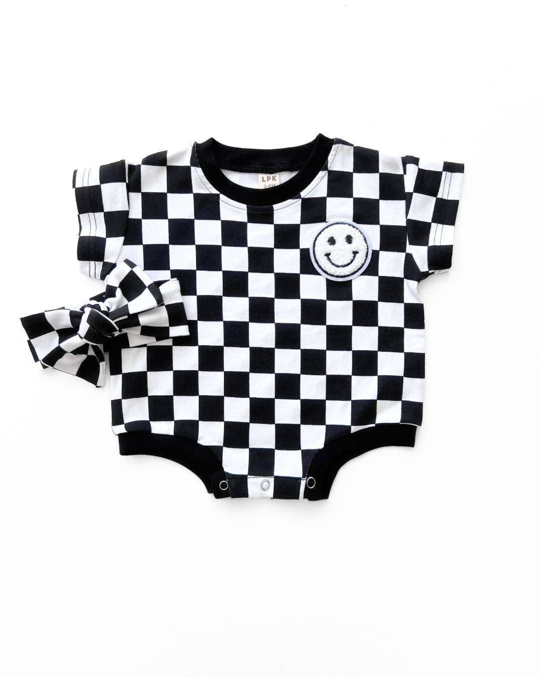 Short Sleeve Bubble Romper | Checkered Smiley Black
