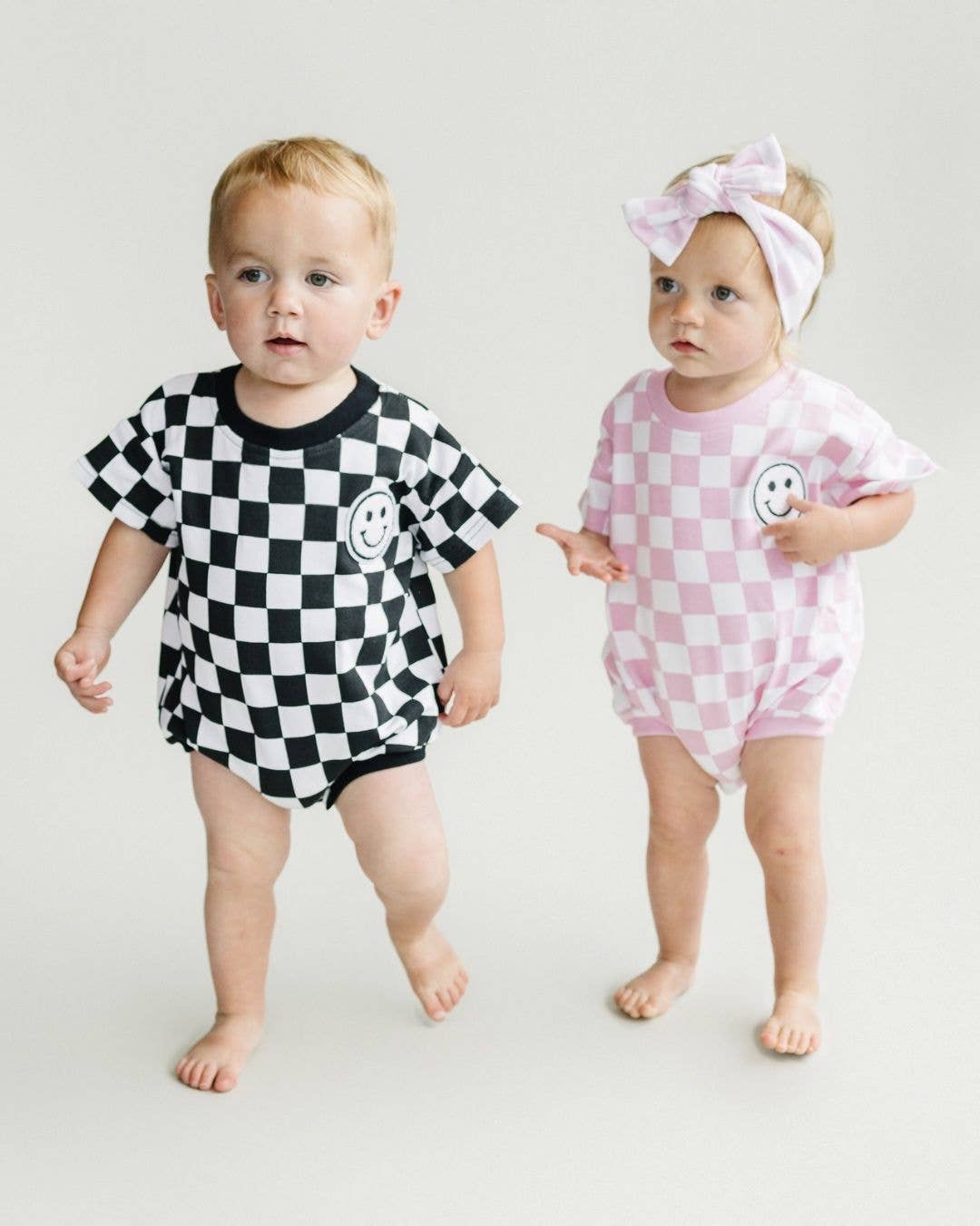 Add some checkered style to your little one's wardrobe with this bubbly romper featuring a popular smiley design. And the best part? It's gender neutral!